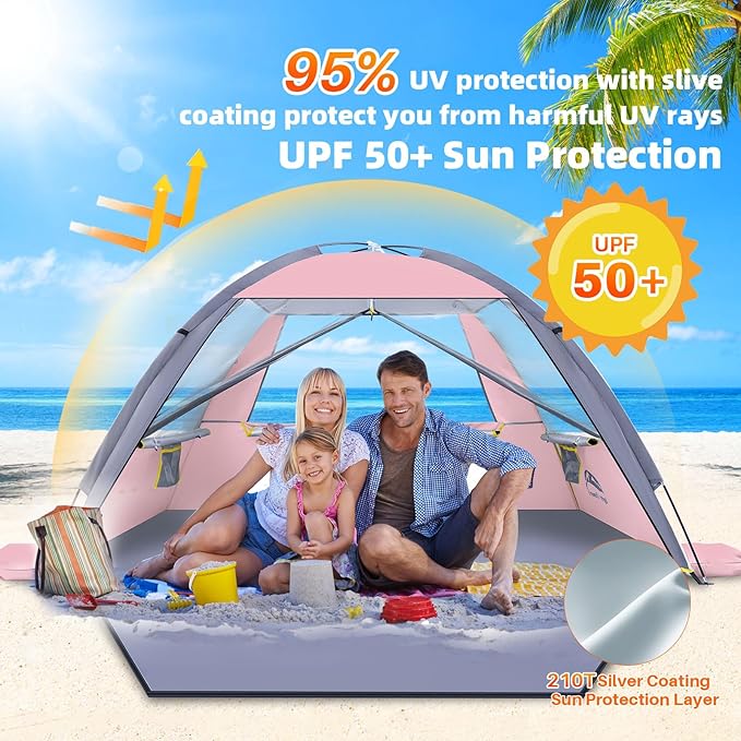 • 【Excellent Ventilation & Views】The beach tent sun shelter adopts a four-side ventilation design, equipped with a zippered door and three adjustable large ventilation windows with screens. Moreover we increased the height of the door and added a screens on the doors. It has a sand-proof effect, not only providing great ventilation, Keep cool all the time, but also gives you a better views appreciation of the beautiful beach scenery.