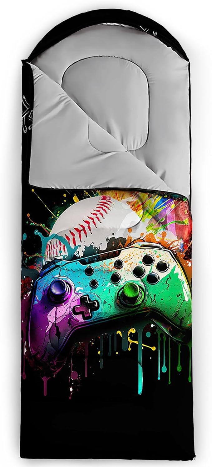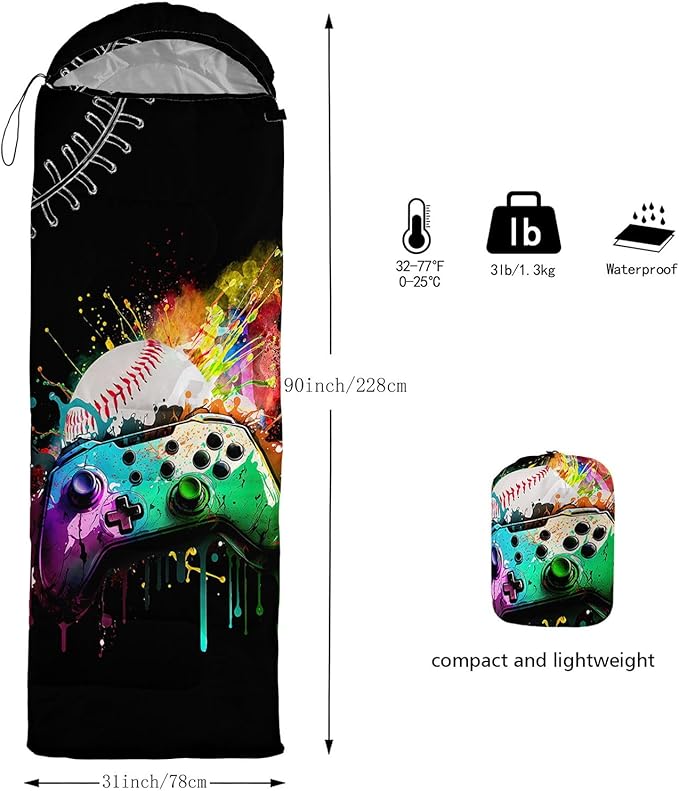 • SUITABLE:The sleeping bag can be used for 3 Seasons.SIZE:90.5"L x 31.5"W Suggenal extreme temperature: 41 ℉ -77 ℉.Applicable in a variety of scenarios,such as Travel camping pajamas party,It's very suitable for you to travel with your children.Half-circle hood with adjustable drawstring,which can keep you warm and prevent your humidity